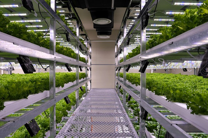 ▲SB위드아그로의 실내 수직농장에서 엽채류가 재배되고 있는 모습.